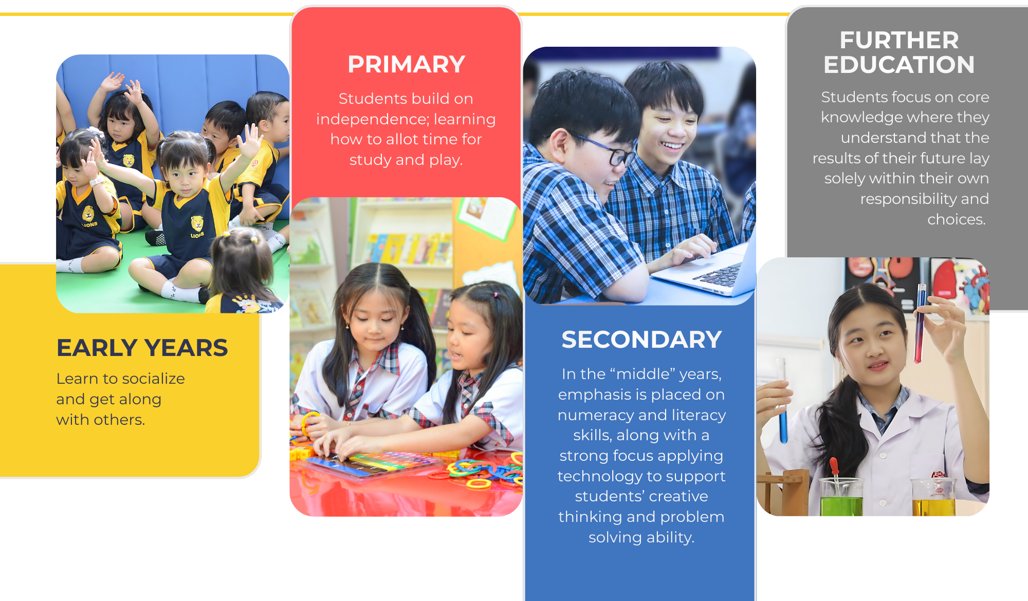 Having all year levels in one convenient location allows us to better plan for students’ development and to monitor their progress.